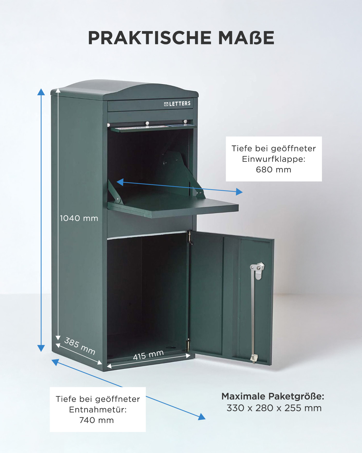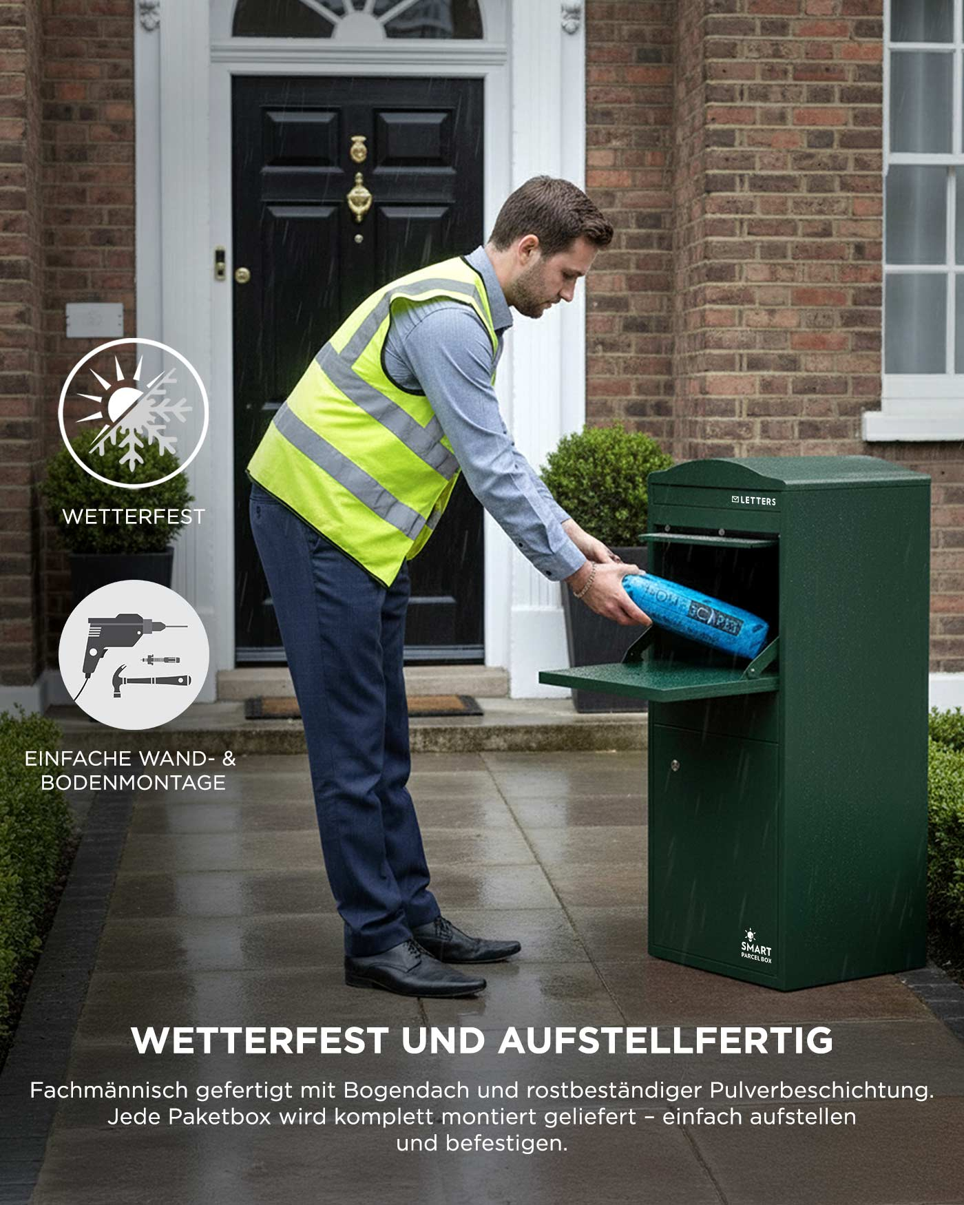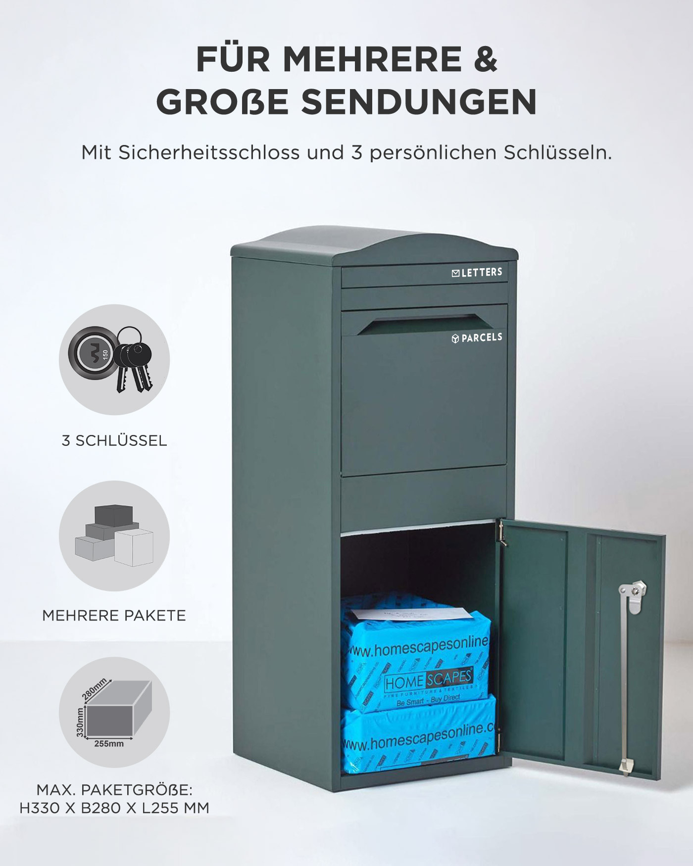 Die praktische Lösung für die Lieferung von Paketen und Briefen in Abwesenheit: SMART PARCEL BOX™ XXL – der geräumige Standbriefkasten mit Paketfach in stilvollem Dunkelgrün mit formschönem Bogendach bietet reichlich Platz für Pakete und kann mehrmals täglich beliefert werden.