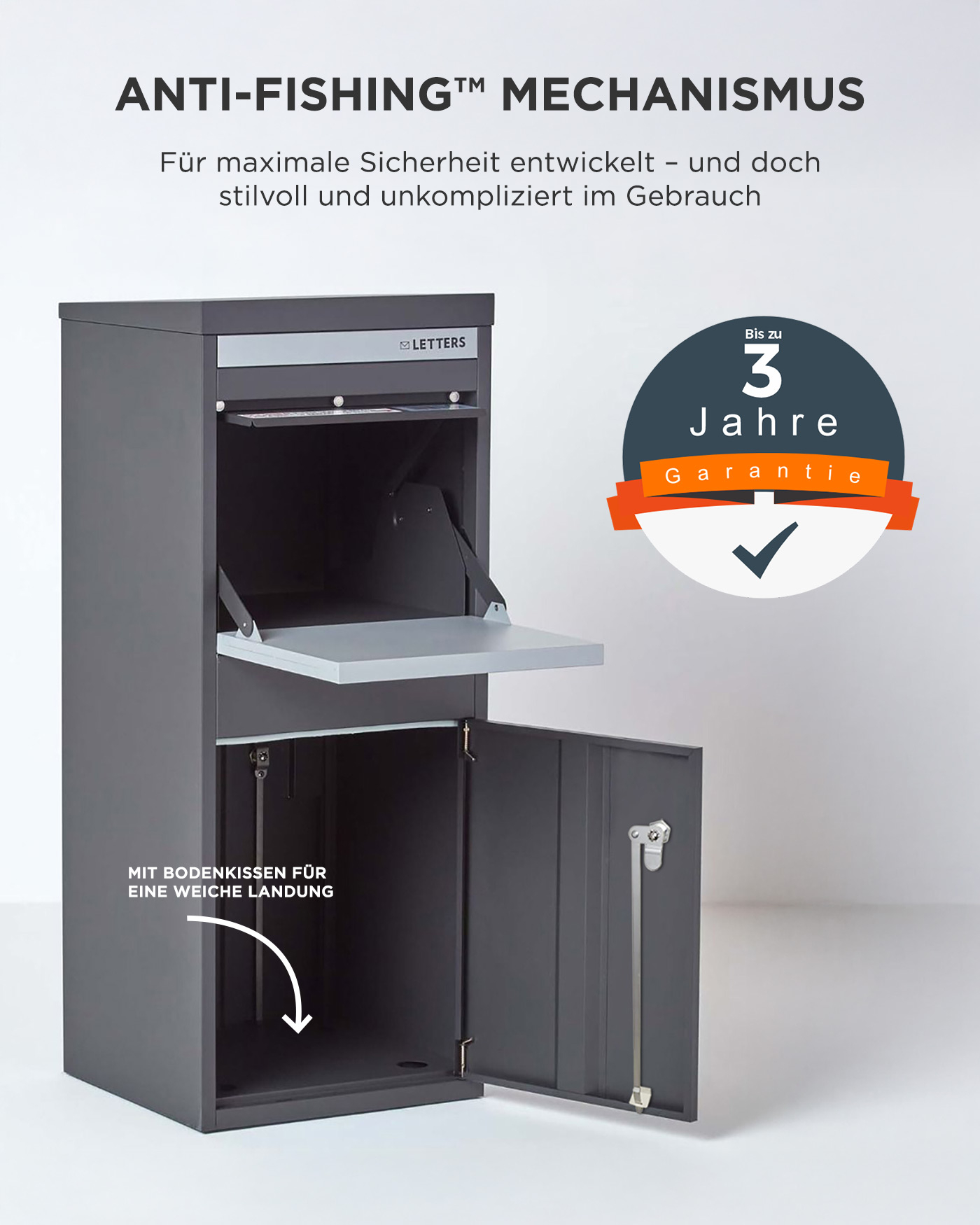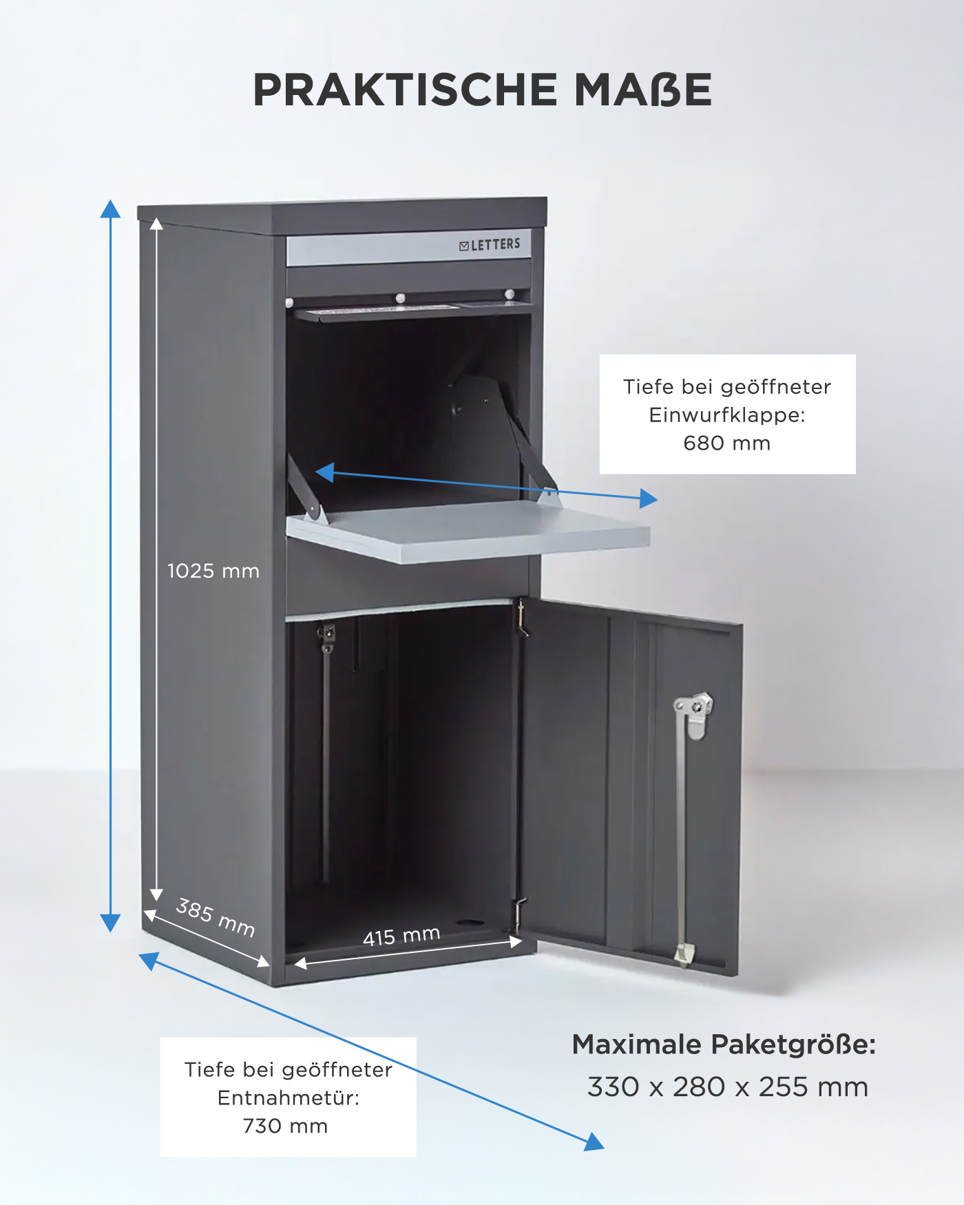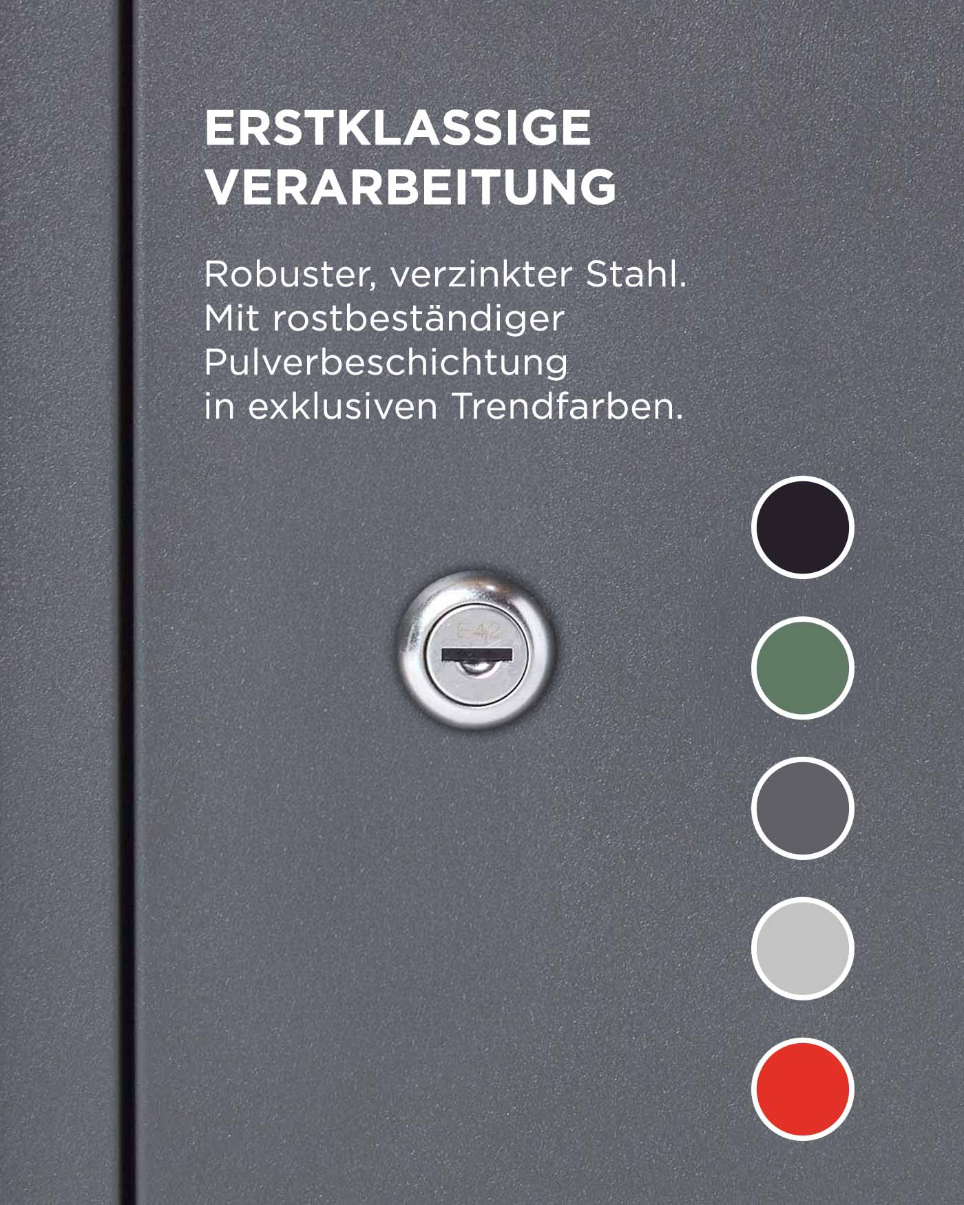 | RAL Code | Gehäuse: RAL7024; Brief- & Paketklappe: RAL9003. |