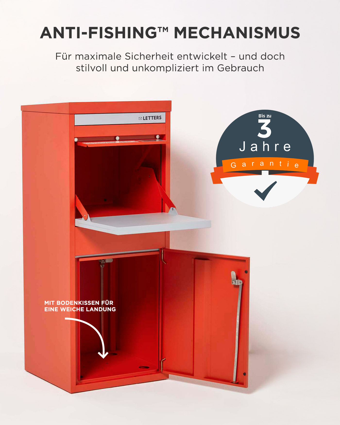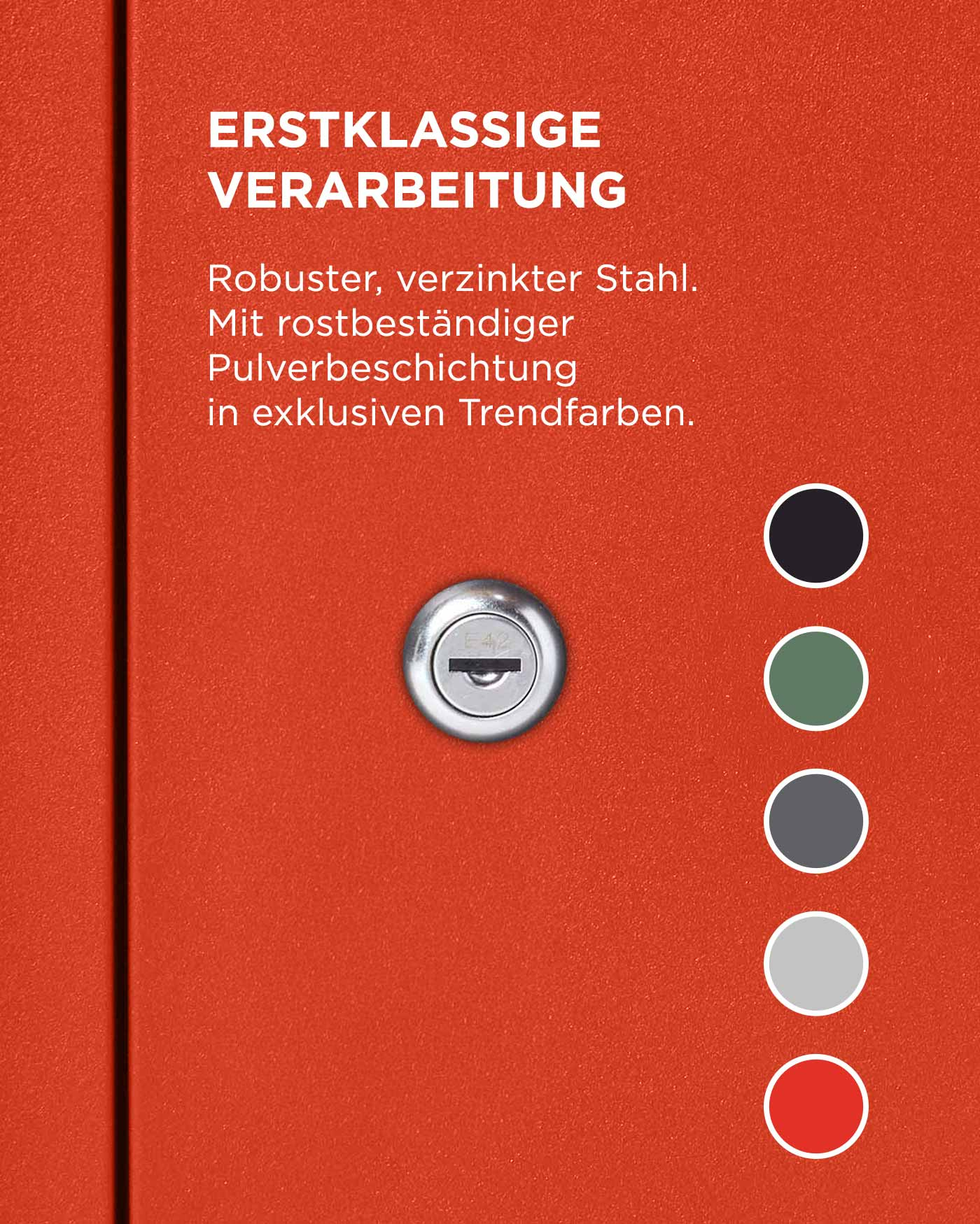 Ihr Paketkasten ist mit einer hochwertigen Pulverbeschichtung versehen, die auch Regenwetter hervorragend standhält. Diese Beschichtung ist verschleiß-, abrieb- und witterungsbeständig. Wenn die Farbe, die Sie verwenden wollen, nicht den gleichen Standards entspricht, wird sie die Leistung der Pulverbeschichtung nicht erreichen. Dadurch kann auch die Garantie für Ihren Paketkasten erlöschen.