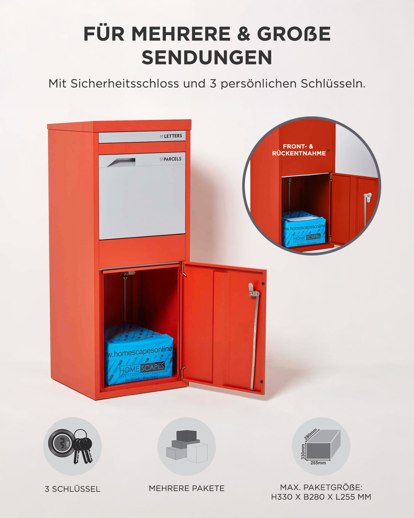 Der große Paketbriefkasten ist ideal für die sichere Lieferung von Paketen bis zu 330 x 280 x 255 mm. Die Paketbox kann mehrmals am Tag beliefert werden und die Pakete werden durch die integrierte Rückholsperre und das spezielle Schloss sicher verwahrt. Der praktische Paketbriefkasten ist einfach an der Wand oder freistehend am Boden installierbar. Freistehend montiert ist die Paketentnahme auch auf der Rückseite möglich.