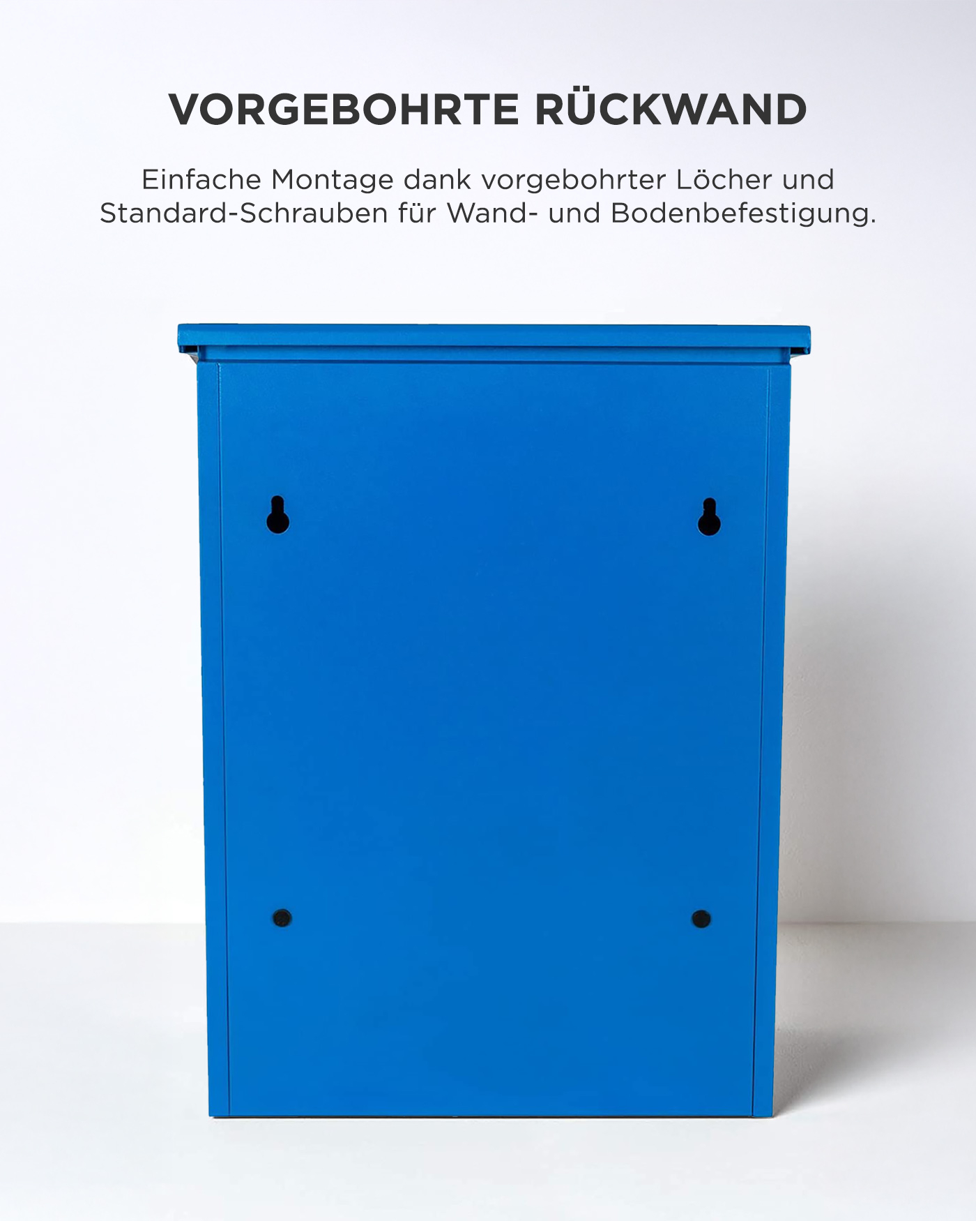 Der farbenfrohe blaue Wandbriefkasten ist aus verzinktem Stahl gefertigt, mit einer haltbaren Pulverbeschichtung überzogen und rostbeständig und wetterfest. Die SMART PARCEL BOX™ eignet sich zur Wandmontage und Bodenmontage.