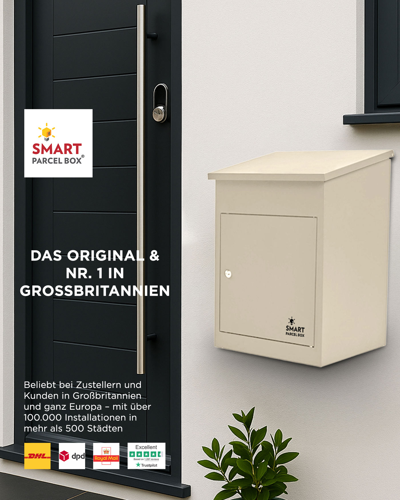Kompakter Briefkasten für Pakete: Die SMART PARCEL BOX™ in Cremeweiß ermöglicht die einfache, sichere und bequeme Lieferung von Briefen und Paketen in Abwesenheit.