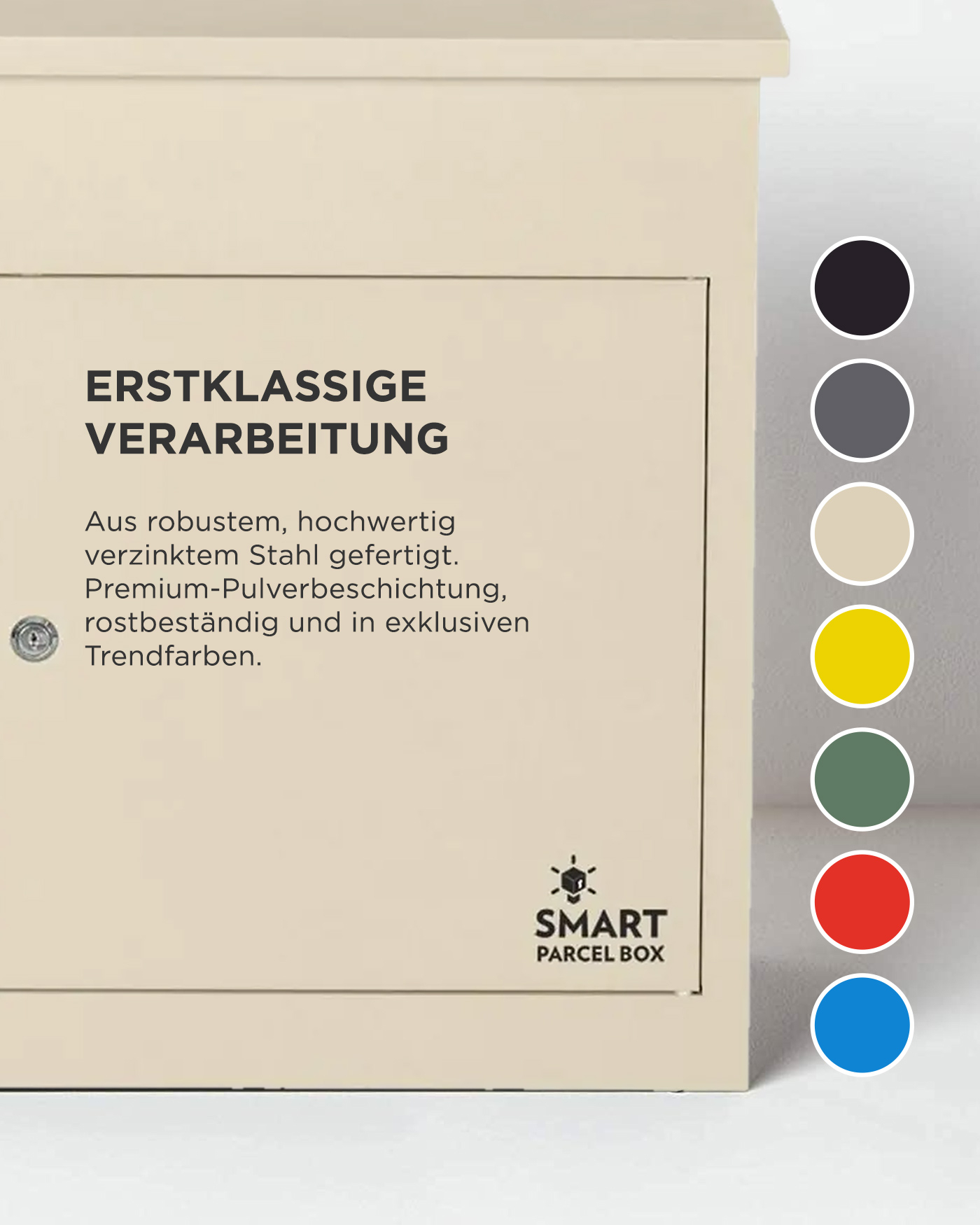 Die wetterfeste Paketbox eignet sich zur Wand- und Bodenmontage und bietet genügend Platz für mehrere Lieferungen am Tag. Jede SMART PARCEL BOX™ ist aus robustem verzinktem Stahl gefertigt und mit einer witterungsbeständigen Pulverbeschichtung ausgestattet.